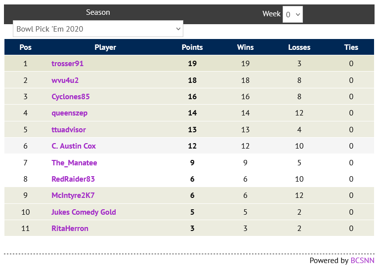 BCSNN 2020 Bowl Pick 'Em | Champion: trosser91