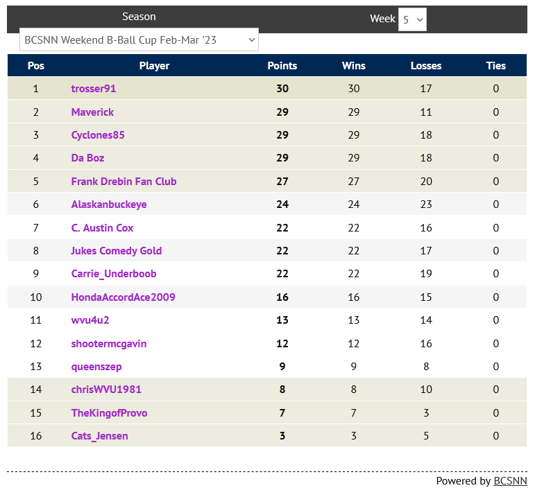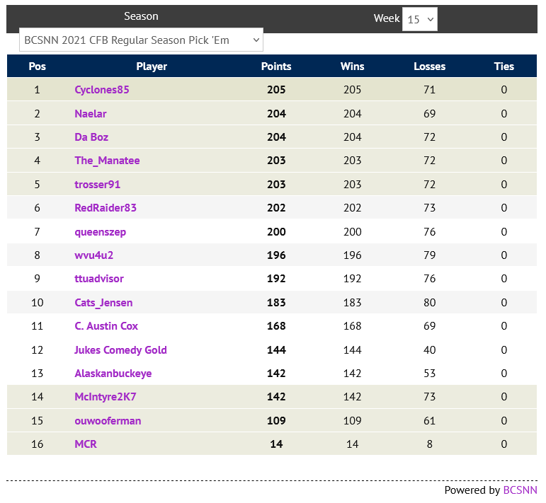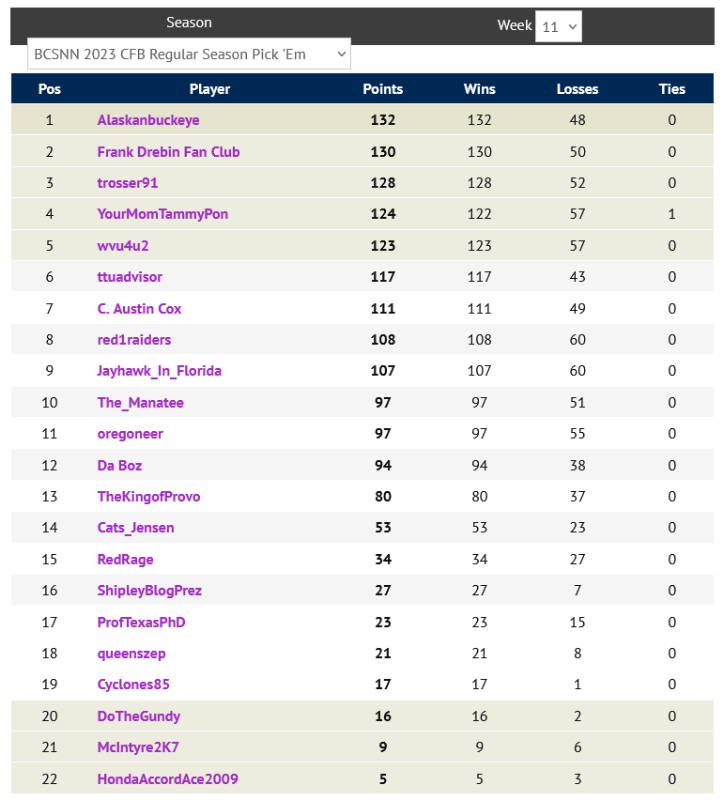 Below are the past rankings for BCSNN Pick 'Em participants: